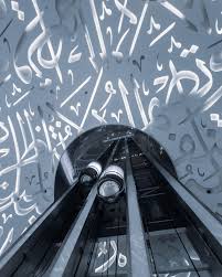 Architecture: A 77-meter-tall hollow ring-shaped structure covered with Arabic calligraphy, symbolizing knowledge and the unknown future.